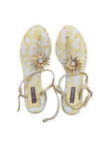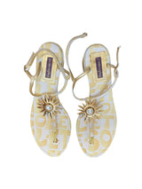 A gorgeous, printed canvas, block heel sandal with a spectacular gold and crystal sun embellishment epitomizes a a summer in Italy. Wear to your hearts desire.