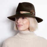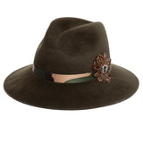 No hiding here! Standout in out in our Loden felt hat with Camo Grosgrain band and feather jewel buttonaire. You are sure to attract attention!