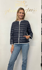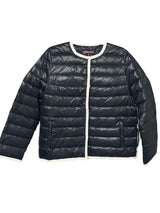 A collarless down jacket with black embroidered plaquet, cuffs, neckline and trim is the chicest addition to your outerwear collection.  Dress it up, Dress it down. It will be a go to for 9  months!