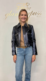 A vintage inspired jacket, reimagined in Navy Metallic Nappa Leather accented with subtle gold tone hardware. We love this jacket for everyday but better yet, wear with a black tie dress for cool girl chic!