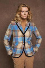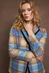 A slim fit, chic camel wool blazer is enhanced with a wide check in light blue and dark rose. Navy blue velvet defines the collar and trims the jacket.  It is lined in light blue. Pair with one of our funnels  and hats for the perfect finish.
