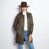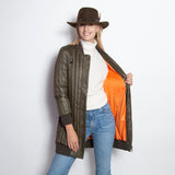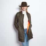 What a fabulous piece! Vertical quilting makes this coat very slimming. Details include double zipper, knit cuffs and a bright orange inside. A very happy piece!