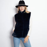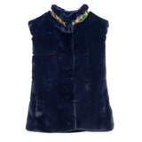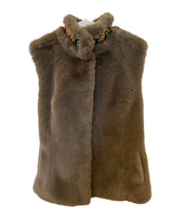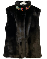A plush faux fur vest with a vintage ribbon trim on the neckline gives us some Alp-like vibes.  Detailed yet understated.