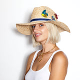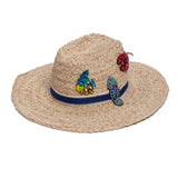 You don't have to be a mermaid to love this hat! This ode to under the sea, looks spectacular above ground. Soft, wide weave straw in a life guard style hat has glittering accents for a whimsical take at the beach.