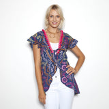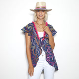 It's a cover-up. It's a jacket. It's a tunic. It's a versatile piece in your wardrobe! Inspired by a kimono, this cap sleeve, ruffle and tie front gem goes from cabana to cocktails with ease. Flirty and fun, it is a fab addition to your summer line up!