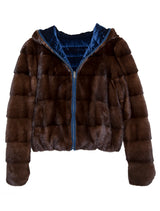 It doesn't get any better than this--A hooded mink bomber that is as elegant as it is sporty! Wear it around town, to black tie or on the slopes, it is a show stopper! The added bonus is that it fully reverses for hidden mink on the inside and a mink lined hood! Brown Mink/Navy Velvet.